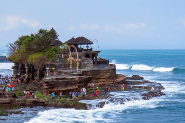A 15h visite temple royale de Mengwi, Continuer a visiter temple Tanah Lot situe sur un rocher dedie au dieu de la mer. Si on a de la chance qu’on pourrait assister au coucher du soleil.